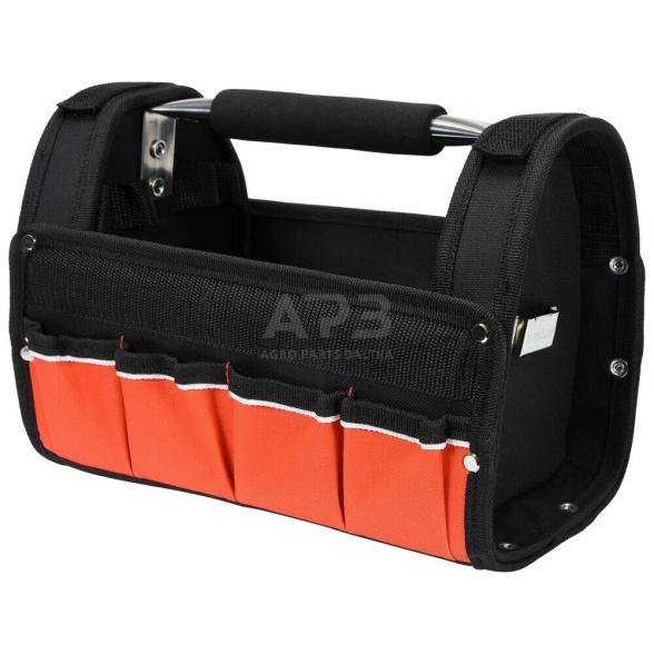 Didelis, atviras įrankių krepšys, pagamintas iš techninio 600 D poliesterio. Dėžutės dugnas su sustiprinta, drėgmei atsparia konstrukcija. Galvos siūlės ir kišenės patvarios versijos. Centrinė rankena pagaminta iš metalinio vamzdelio su minkštu neslystančiu dangteliu, atlaiko dideles apkrovas ir stabilizuoja konteinerio formą. Su 9 skirtingo dydžio ir paskirties kišenėmis.