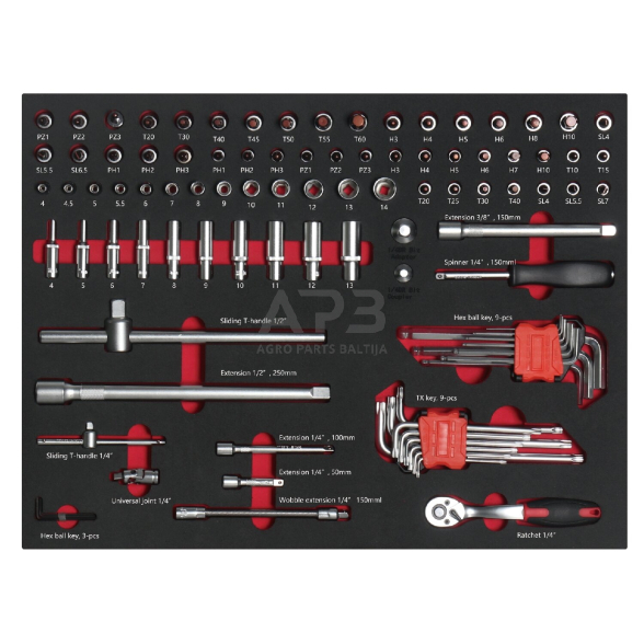 Padėklas. TRGJB121 Smūginių galvučių ir antgalių rinkinys 1/4" + 3/8" 99 vnt.