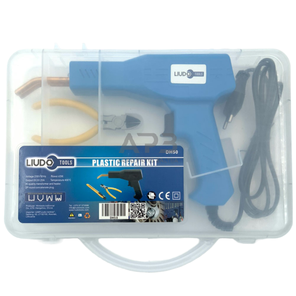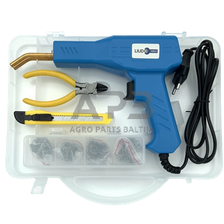 Priedai: plastiko remonto rinkinį sudaro 4 skirtingos suvirinimo kabės (lygios, banguotos, vidinio kampo ir išorinio kampo), šoninio kirpimo replės kabėms, peilis su keičiama geležte ir lagaminas