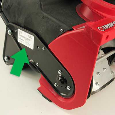 - Po išmetimo dangčiu: Pakelkite galinį žolės išmetimo dangtį (kur kabinasi krepšys). Lipdukas gali būti ant korpuso.
