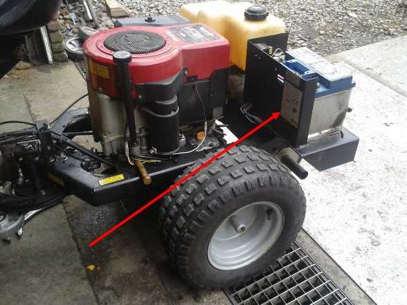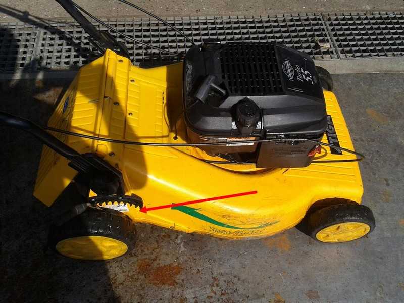 - Arba šalia dešiniojo galinio rato, už pjovimo aukščio reguliavimo svirties. Dėmesio: šioje vietoje esančius numerius gali būti sunku įskaityti (žr. nuotrauką žemiau).