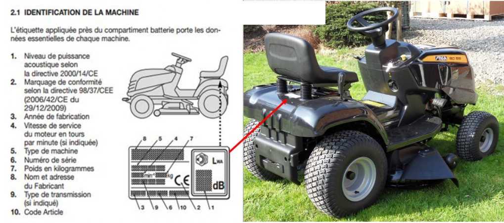 Ant visų sodo traktoriukų (užsėdimų vejapjovių) identifikacinis lipdukas (lentelė) yra po sėdyne:
