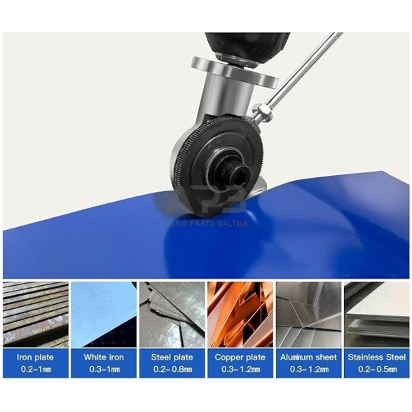 Platus pritaikymo spektras: Pjovimo priedas yra skirtas lengvo metalo plokštėms, gali pjauti 0.2-1 mm geležį, 0.3-1 mm baltą geležį, 0.2-0.8 mm plieną, 0.3-1.2 mm varį, 0.3-1.2 mm aliuminį, 0.2-0.5 mm nerūdijantį plieną, netinka nerūdijančiam plienui ir specialioms didelio kietumo lydinio plokštėms jeigu daugiau nei 0.5 mm