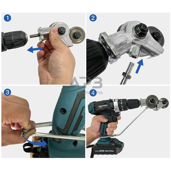 Lengva naudoti: Pjovimo priedas gali lengvai paversti įprastą elektrinį grąžtą metalo pjaustytuvu, kuris sklandžiai atliks savo užduotis, nesunkiai pjaustysite plonus metalinius lakštus. Turime pritaikytą rankeną, kurią galima naudoti daugeliui elektrinių suktuvų-grąžtų. Lengva nešiotis, patogu laikyti, kai nenaudojama, lengvai tilps į jūsų įrankių dėžę.